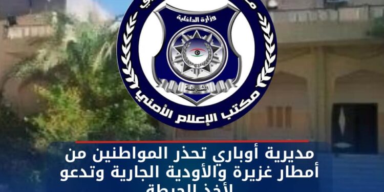 مديرية أمن #أوباري تحذّر جميع المواطنين والأجانب المقيمين في نطاق المديرية من التنقل بين المناطق، بسبب هطول أمطار غزيرة على معظم المناطق. مشيرةً إلى أن هناك توقعات عن جريان بعض الأودية القريبة من غرب المدينة.