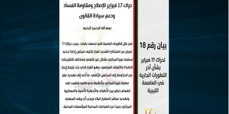 حراك 17 فبراير بـ #مصراتة يستنكر قرار تكليف مجلس إدارة جديد لمصرف #ليبيا المركزي بشكل مخالف للتشريعات النافذة والاتفاق السياسي، موضحًا أن القرار تم بإيعاز من الحكومة إلى الرئاسي وتسبب في تهديد مقر المصرف ومنظومته وموظفيه والتدفقات المالية للمؤسسات في الدولة، كما أدى إلى انقسام خطير بين الأجهزة الأمنية والعسكرية وتهديد مباشر لاستقرار البلاد.
